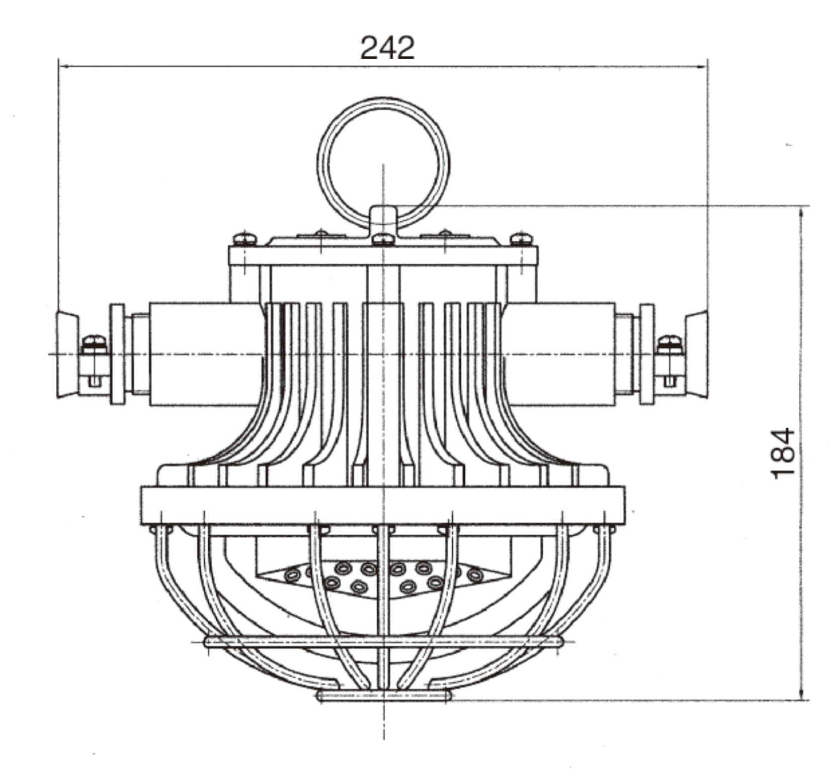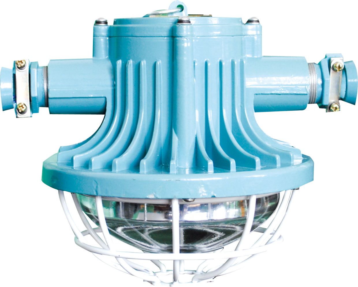 LED燈由上蓋、上殼體、下殼體、防爆透明玻璃罩、護(hù)罩等組成,上蓋與上殼體用M4螺釘連接,下殼體用M6螺釘與上殼體相連。防爆透明玻璃罩、護(hù)罩用M4螺釘固定在下殼體上。上殼體外有M4外接地螺釘、銘牌等。上殼體內(nèi)有接線板、M4內(nèi)接地螺釘、LED驅(qū)動(dòng)電源板。下殼體內(nèi)有密封墊、防爆透明玻璃罩、LED光源、散熱板。散熱板通過上殼體將光源熱量散發(fā)到燈體外。上蓋、上殼體、下殼體、防爆透明玻璃罩之間均有符合規(guī)定的隔爆接合面隔爆。